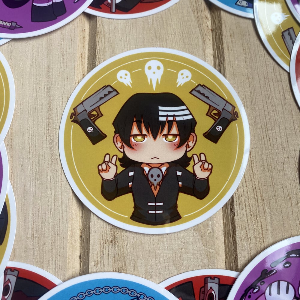Glossy 3"x3" circular vinyl stickers depicting the main characters from the anime Soul Eater!